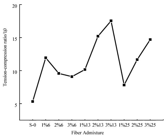 To conduct an in-depth exploration of the influence exerted by steel fibers on the strength of concrete, this study undertakes a further analysis of the data obtained from the experiments described in the previous sections, thereby deriving the tension-to-compression ratio of the test specimens. Subsequently, a line graph is constructed, with the steel fiber content designated as the x-axis and the tension-to-compression ratio as the y-axis, as presented in Figure 8. The values on the y-axis signify the ratio of the flexural strength to the compressive strength of the specimens. Evidently discernible from the graph, the incorporation of steel fibers leads to a notable enhancement in the tension-to-compression ratio of self-compacting concrete.