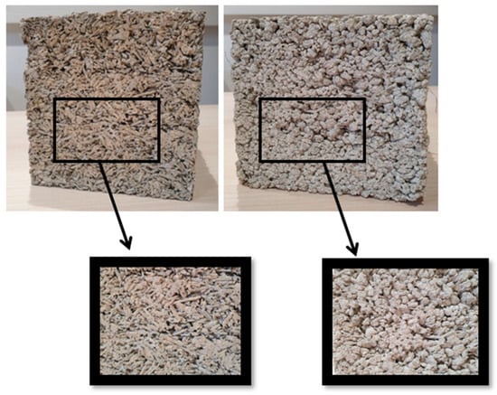 The double inclusion model considers the shape and orientation of the double inclusion and the properties of the reference medium, which must be specified based on the morphological and microstructural considerations. The external geometry of the double inclusion should reflect the arrangement of inclusions within the material. The coating phase (binder) has the same shape and orientation as the original inclusion (plant aggregate). Then, this new coated inclusion is processed using the Mori–Tanaka model. The results differ from the previous model because the matrix enveloping the coated inclusions is air and not hydraulic binder. In the case of two-phase composites, the volume fraction of the double inclusion equals the volume fraction of the inclusion. The double inclusion model is particularly suited for multiphase materials []. However, applying it to bio-based building materials poses challenges in assessing the thickness of the coating, which is not well documented in the literature. Nevertheless, the macroscopic granular appearance of plant-based concretes is evident when the volume fraction of aggregates is significant; plant aggregates are coated by the binder and bonded together (Figure 3).