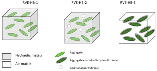 Determining the RVE a critical point in homogenization. Given the complexity of plant-based concretes, several possibilities are conceivable. An RVE consisting of a binder matrix with only aggregate inclusions is a first-line solution. It is particularly relevant when the volume fraction of plant aggregates is low as it can be assumed that they are largely enclosed by the binder matrix in the composite. This type of RVE is referred to as “HB-1”. When the aggregate volume fraction is more important, the additional porosity between the aggregate and the binder is more difficult to neglect. Indeed, the literature commonly refers to tri-modal porosity in the case of hemp concrete (intra-binder porosity, intra-particle porosity, and porosity at the interface between the binder and the plant particle) []. In this case, additional porosity is defined compared to the previous case. Without any particular indication found in the literature, the additional porosity (air) was considered to be anisotropic (spherical inclusion) in the case of plant-based concretes. This type of RVE is referred as “HB-2”. Finally, the plant particles may appear to be simply embedded in the binder and arranged in a relatively random way. From this point of view, an RVE describing coated particles bathed in an air matrix also seems relevant (cf. Section 2.1.2). The thickness of the binder layer around the particle represents in the first instance 20% of the total volume of the coated inclusion (cf. Section 2.2.1). This latter case is noted “HB-3”.