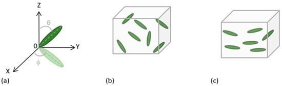 The orientation of aggregates in composites can be defined by two angles. Θ is the angle between the main axis of the inclusion and the Z axis in global coordinates, while φ denotes the angle between the projection of the inclusion in the XY plane and the Y axis. Due to the lack of precise and exhaustive knowledge regarding the actual orientation of aggregates in the materials under consideration, this study makes two assumptions in line with X-ray tomography results []. Firstly, it assumes that aggregates are randomly oriented in all directions (“random 3D” assumption). Secondly, it assumes that compaction during placement induces random orientation only in the XY plane (“random 2D” assumption), illustrated in Figure 5.