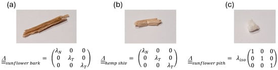 Plant aggregates considered in the study: photo and components of the particulate thermal conductivity tensors in the transverse isotropic case (sunflower bark (a) and hemp shiv (b)) and isotropic case (sunflower pith (c)).