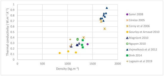 The thermal conductivity of vegetal concrete varies according to formulation—type of aggregate, nature of binder, and binder/plant aggregate ratio []. Some authors conclude from experimental data that the binder has less influence while others indicate that it has a significant impact on the material’s thermal behavior [,]. Similar questions arise about the influence of the type of plant aggregate used []. The consensus seems to be that thermal conductivity is linearly dependent on material density [,], although other empirical exponential formulas can be put forward []. Thermal conductivity may decrease with density and with the concentration of plant aggregates. Nevertheless, the influence of the binder or the plant aggregate is not identified to date. Consequently, recent studies underline that density alone is not a good predictor of the thermal performance of bio-based materials []. Consequently, emerging research aims to efficiently predict the thermal conductivity of plant-based concretes [,]. To date, authors could not find any reported established correlation between the formulation (material implemented in the wet state) and the thermal conductivity of the stabilized material (i.e., in the wall before the significant aging and evolution of its physical properties).