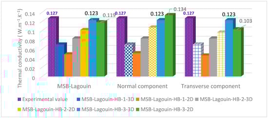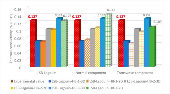 From the data available in the selected reference, each component of the particulate thermal conductivity tensors of sunflower bark is calculated in this work. These dry reference values at 20 °C were chosen as the reference values. In addition, to consider a change of aggregates in the modeling, the particulate thermal conductivity values of the hemp shiv are also calculated from the experimental results. This method can be extended to any other plant aggregate. For sunflower pith, the values was retained from previous work []. The method used and the dry reference values are listed in Table 4.