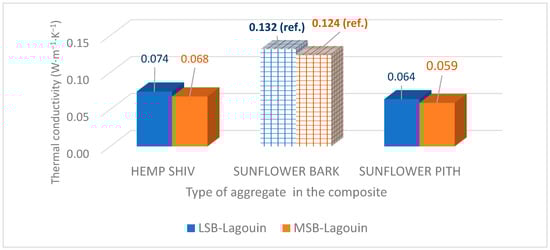 The results for hemp shiv are relatively consistent with those found in the literature [,]. However, it is slightly lower, which can be explained by a slightly higher porosity of the aggregate used compared to the average of hemp aggregates. To our knowledge, no experimental reference exists for the particulate conductivity of the sunflower bark. However, since sunflower bark is less porous than hemp shiv, the result is consistent with expectations that there is very low thermal conductivity. Therefore, the high potential of sunflower pith should be emphasized, which is consistent with an intra-particle porosity of the order of 95% intra-particle porosity [].