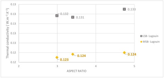 The studies selected for comparison and validation with the models are chosen based on several criteria. Firstly, specific data for each scale’s material are required as this forms the basis of the input data for modeling. This includes the thermal conductivity of the binder alone and that of the bulk aggregates (or their particular porosity if thermal conductivity is not available). Additionally, the temperature and relative humidity conditions for measuring the composite’s thermal conductivity have to be specified, which is not systematically done in the literature. An assessment, even if incomplete, of the volume proportions of each phase of the composite (inclusion, solid phase or total porosity) has to be provided in those references. Moreover, the material implementation must be clearly explained to assess the possibility of the preferential orientation of plant particles. Given these constraints, few works in the literature can be retained. The selected experimental work is one of the few to provide the key elements needed for modeling.