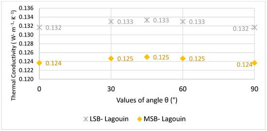 The method applied here has already demonstrated its suitability for predicting the evolution of the thermal conductivity in sunflower pith panels over the entire temperature and relative humidity range of use []. It is assumed that water-binding takes place only at the level of the plant particles, so any adsorption at the level of the binder is neglected in this study. Similarly, any variation in the thermal conductivity of the binder as a function of temperature is not considered.