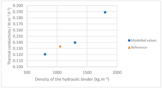 The construction sector’s carbon footprint requires a rapid and sustained transition to limit the environmental and social consequences of global warming [,]. Bio-based building materials are increasingly recognized for their low environmental impact, providing viable alternatives to conventional high-impact materials []. Despite their potential, the large-scale adoption of these materials remains limited to date due to various technical, political, and societal barriers []. Plant-based concretes are made from a mixture of water, plant particles and lime or metakaolin-based binders. The choice of binder is crucial as it determines the mechanical, economic, and environmental properties of the composite []. Its impact on thermal conductivity is still under discussion in the literature [,]. Modeling can be a useful addition to the discussion.
