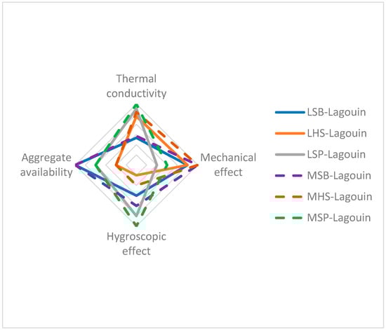 Secondly, the selected models are used as optimization tools to study the effect of particle orientation, nature and shape. The approach aims to illustrate that modeling enables to control both the size and orientation of aggregates to study their effects, optimizing not only the formulation but also the implementation. However, the optimization cannot be confined to the thermal aspects of building materials. Other factors are considered, such as mechanical or hygroscopic aspects, or resource availability, to achieve a more global approach to optimizing formulations in line with the composite’s expected performance in use. Consequently, a multi-criteria approach is suggested, combining several factors studied in the literature such as mechanical properties, hygric properties, and the availability of plant aggregates. The intent is to assess the performance of plant-based concretes on a broader scale, beyond their thermal properties.