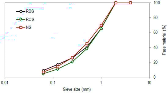 Hydraulic lime type NHL-3.5 produced and distributed by a Spanish company, Cemento Natural Tigre, was used as a binder in this study. The lime had a compacted bulk density of 660 kg/m3 and conformed to EN 459-1 []. The lime consisted of mainly calcite (CaCO3), portlandite (Ca(OH)2), quartz (SiO2), larnite (Ca2SiO4) and a small quantity of lime (CaO). The fine aggregates used in this study (Figure 1) were of three types: natural river sand (NS), recycled-concrete sand (RCS) and recycled-brick sand (RBS). The natural sand was collected from a natural-aggregate quarry, located in Cataluña, Spain, and was used for the production of the control mortar. The recycled-concrete sand as well as the brick sand was procured from a construction and demolition recovery plant, also located in Cataluña, Spain. The NS, RCS and RBS had similar mineralogical composition with mainly quartz (SiO2), calcite (CaCO3), albite (NaAlSi3O8), microcline (KAlSi3O8), chamosite ((Fe2+,Mg)5Al(AlSi3O10)(OH)8), mica (Al2K2O6Si), and dolomite (CaMg(CO3)2). The XRD diffractograms for the materials are available on request. The sands were sieved to remove all particles greater than 2 mm and the amounts of fines were adjusted to between 5% and 9%. The particle size distribution of the sands is shown in Figure 2. Burnt bricks used for the study to establish the properties of historical masonry units and walls against the resulting conservation mortars were produced by Cerámica Piera S. L (Catalan company). The physical properties of the materials are shown in Table 1.