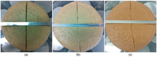 The particle size distribution was carried out based on ASTM D422-63 []. Aggregate indexes, which describe the quantity of fines and the form of the particle distribution curve from the smallest grains to the largest were determined following the method explained by Konow [], where higher indexes are indicators of fine materials and improved properties of the resulting mortars []. The bulk density of the binder and aggregates was determined using CPC 14.2 of the RILEM TC [] method. The apparent, dry and surface-saturated dry density, water absorption and porosity of the fine aggregates were determined using a pycnometer according to the UNE-EN [] standard.
