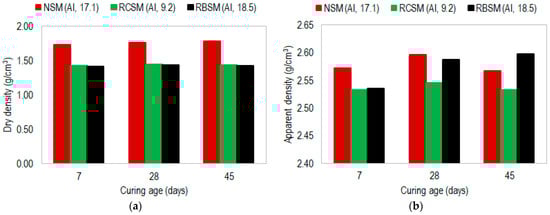 As for the fresh-state density, the hardened natural sand mortar was denser than mortars with recycled materials. The dry density of the control mortar slightly increased with age (Figure 5), while there was no increase in density for mortars with recycled fine sands. At the age of 7 days, the apparent density of natural sand mortar was found to be slightly higher (ca. 1.2%) than that of recycled sand mortars (Figure 5). The density of all mortars increased slowly up to the age of 28 days with the recycled-brick-sand mortar (RBSM) having the highest rate of increase, about 2%, compared to the natural-sand mortar (NSM) (1.2%) and the recycled-concrete-sand mortar (RCSM), with an increase of about 0.4%. After 45 days, the density of recycled-concrete-sand and natural-sand mortars dropped slightly while the density of the mortar with recycled-brick sands remained nearly constant. At that age, recycled-brick and recycled-concrete-sand mortars were +2% and −1.2% denser than the natural sand mortar, respectively. While the density of the recycled sands was similar, see Table 1, the apparent (particle) density of the resulting mortars was different, as seen in Figure 5. The higher density of the RBSM was attributed to the pozzolanic reaction of the clays in burnt bricks with portlandite formed in the mix, forming products that densified the matrix. On the other hand, the dry bulk density of the RCSM and RBSM was similar and lower than that of the NSM due to the higher porosity of the recycled materials.
