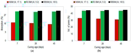 (a) Water absorption and (b) volume of pores of mortars at different ages (Note: results reported are the average of two measurements).