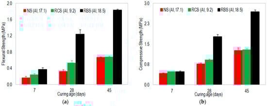 As a result of pozzolanic reactions [,,] of the clays in burnt bricks with the portlandite, the mechanical properties of recycled-brick-sand mortars were exceptionally high except for the high porosity of the recycled brick sand. Although a cement binder was used, Huang et al. [] associated the performance of cement mortars with the formation of addition hydration products in pozzolanic reactions between crushed-clay-brick aggregates and portlandite formed in the system, the densification of interfacial transition zone and the attendant increase in fracture toughness of the mortars. While Konow [] indicated that higher aggregate indexes improved performance of lime-based mortars, the case appears to differ when mortars with different aggregates are compared. The flexural and the compressive strength of natural-river-sand mortar (NSM), recycled-concrete-sand mortar (RCSM), and recycled-burnt-brick-sand mortar (RBSM) are shown in Figure 7, with the aggregate index (AI) shown in the legend. The flexural strength of mortars with recycled sands cured for 7 days was higher than the strength of the control mortar, i.e., the natural-sand mortar. At that age, the RCSM and the RBSM showed 44% and 131% higher strength values, respectively, than the NSM mortar. Similarly, the respective strengths at the age of 28 days were 68% and 300% higher than that of the NSM. After that age, the rate of increase in strength relative to the reference mortar decreased slightly, and after 45 days, the flexural strength of the RCSM and RBSM was higher than that of the NSM by about 3% and 177%, respectively.