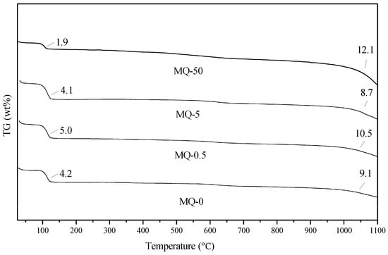 Thermal analysis of samples MQ-0, MQ-0.5, MQ-5, and MQ-50.