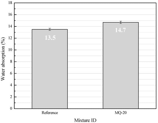The pH values obtained in the test were 8.3 and 8.4 for the reference and MQ-20 specimens, respectively, suggesting that the incorporation of the QW did not affect this property. According to ASTM C1396 [26], these results classify the plates as normal plates (i.e., inside a range between 6.5 and 10.5 pH).