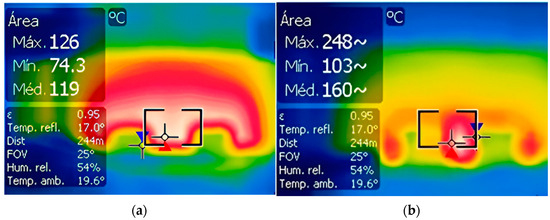 The heat distribution in the plates at the end of the tests is shown in Figure 12. The temperatures reached in the MQ-20 specimen were higher than those of the reference plate, with the MQ-20 specimen reaching a maximum temperature of 248 °C and the reference reaching 126 °C. The heat distribution across the area of the plates is also visible, being represented by more reddish tones. Although the reference specimen exhibits lower temperatures compared to the composite, the area where heat is distributed is larger; this could be due to the higher thermal conductivity of gypsum (reference) allowing the heat to dissipate more quickly over a large surface area [49].