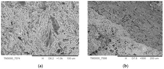 The following images obtained by SEM of the specimens before and after heating are presented to evaluate the changes in their matrix structures (see Figure 13). Figure 13a,b show the crystals formed during the hydration process, some small common pores, and no changes in the microstructure after heating. Figure 13c shows the MQ-20 specimen, highlighting the interface between the EC grains and the gypsum crystals. Figure 13d shows quartz grains among the gypsum crystals, which are still well-adhered to each other.