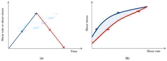 Hysteresis loop test: (a) imposed shear rate (or stress) and (b) response to ascendant (blue) and descendant shear rate (red) ramp.