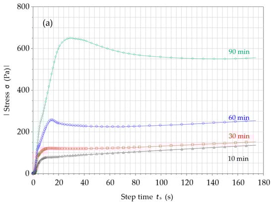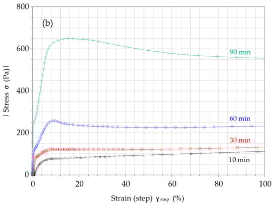 Typical curve evolution of shear stress under low and constant shear rate of 0.005 s−1 after different resting times (10, 30, 60, and 90 min). (a) Shear stress vs. time evolution and (b) shear stress vs. shear strain.