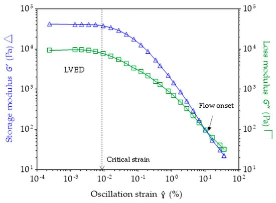 In the LVED, the structure of the suspension is maintained, and the storage (G′, elasticity) and loss (G″, viscosity) moduli remain constant. The critical shear strain marks the end of the LVED, beyond which the material’s internal structure starts to break down. This structural destruction (structural rearrangement or damage, such as the breakdown of flocculated networks) is characterized by a drop in the G′ and G″ (Figure 4) [,,,]. As the oscillatory amplitude strain continues to increase beyond the critical shear strain, the G′ and G″ continue to decrease, and the suspension reaches a yielding point (flow onset) when the G′ becomes equal to the G″, and then, the suspension exhibits a liquid-like behavior [].