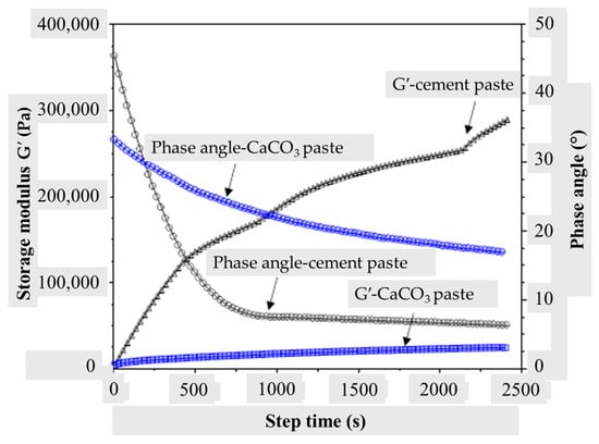 Evolution of the storage modulus and phase angle of cement and calcite pastes (w/b = 0.50) under a frequency of 1 Hz.