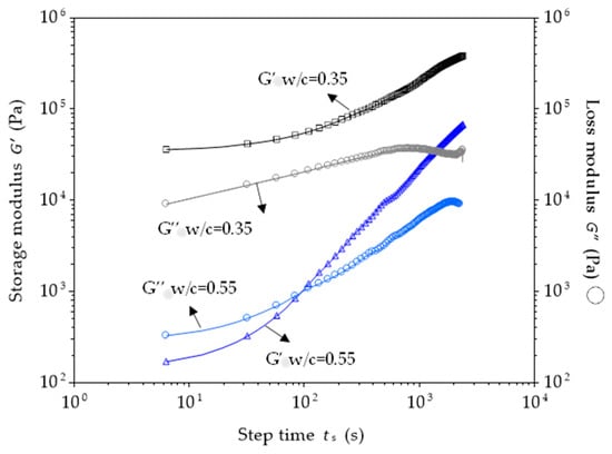 This type of procedure is the most relevant to examine the structural build-up without disturbing the sample during testing. In addition, this allows for the continuous measurement of the structural build-up, capturing the effect of hydrate formation []. However, it requires starting the measurement in the most dispersed state possible to observe the initial increase in the storage modulus. In fact, this initial increase corresponds to the initial flocculation, and the time required to form a percolated path in the suspension is only about few seconds []. This time corresponds to the moment when the storage and loss moduli intersect (Figure 6). For instance, it can be difficult to obtain a dispersed state in a very highly concentrated suspension, even with strong mixing and pre-shearing phases. Such a suspension always displays solid-like behavior (G′ > G″), as shown in Figure 6. This can be attributed to the disruptive shear technique used to obtain the dispersed state of cement paste. As reported by Mostafa and Yahia [], the oscillatory shear has a more significant effect on dispersing concentrated cement suspensions than the rotational shear. Therefore, an effective approach to enhance the dispersion of concentrated cement paste is the combination of rotational and oscillatory shear, particularly when applying a high angular frequency of 100 rad/s. However, this step introduces complexity, which may restrict the applicability of this method for investigating the structural build-up of cement paste.