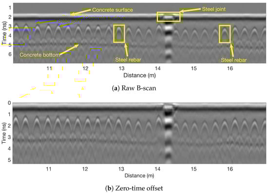 Before performing rebar recognition, raw GPR data should be pre-processed following the procedures recommended in the literature [3,18,19]. The pre-processing procedures will increase the visibility of rebar reflections, reduce the clutter, and shift the image to the correct position. These procedures include zero-time offset, background removal, and migration. We implement these procedures on a B-scan shown in Figure 1a, which was captured over a bare concrete bridge deck.