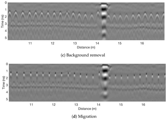 - Migration: Migration is a mathematical algorithm that focuses the hyperbolic signature of point scatterers to several image pixels. Among many migration algorithms, we used Stolt’s f-k migration because of its fast computation time [21]. Figure 1d shows the GPR B-scan after performing migration.