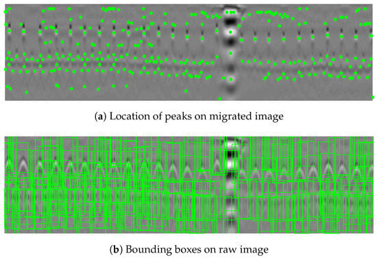 Rebar reflection in the migrated image is concentrated within a region of a few high-intensity pixels. These regions are local extreme points in the two-dimensional B-scan plane. Therefore, a maximum filter returns the location of peaks. To extract maximum points, peak_local_max function from scikit-image Python library was used with a minimum distance of 5 pixels and threshold of 3% of the maximum value in the image. Figure 2a shows the result of peak extraction from the GPR image on the migrated B-scan image. Then a bounding box was defined around every peak, and its content was extracted. The bounding box for a successful image proposal should include a significant portion of hyperbolas in the raw image. Thus dimensions of the proper bounding box may depend on the image resolution and cover thickness. Since all GPR images are interpolated to the same resolution to maintain a consistent scale, and the cover thickness remains relatively uniform across bridges, a fixed bounding box size can be applied. In this study, we used a bounding box of 20 cm (horizontal) × 1.8 ns (vertical) for all bridge data. Figure 2b shows the bounding boxes used for extracting RoIs in GPR images.
