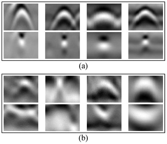 In machine learning classification problems, every input data belongs to a group that describes the content of the data. For example, the MNIST dataset [24]—which stands for Modified National Institute of Standards and Technology—contains 70,000 grayscale images (28 × 28 pixels) of handwritten digits, each labeled with the corresponding digit from 0 to 9. It serves as a widely used benchmark for evaluating image classification models. Unmigrated GPR images, similar to the MNIST dataset, are in grayscale (single-channel images). For single-channel (grayscale) images, the dimension of the input image is n × m × 1, which n and m are the number of pixels of the input image. Since the dimension of feature space is proportional to the size of input images, we propose to increase the dimension of training images to n × m × 2 by adding the migrated rebar reflection image of the same rebar as the second channel. Figure 4 illustrates examples from the training dataset. In Figure 4a, the first row displays raw images of true rebars, while the second row presents their corresponding migrated images. Figure 4b follows a similar structure to show the raw and migrated images of false rebars. Notably, as seen in Figure 4b, some raw images of false rebars exhibit hyperbolic shapes visually resembling those in the true class, highlighting potential challenges in visual detection. The distinction between true and false rebars becomes apparent only when the migrated image (processed version) is incorporated as a second channel in a dual-channel input.