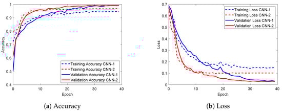Training performance of CNN-1 and CNN-2 models: (a) accuracy trends and (b) loss progression over epochs.
