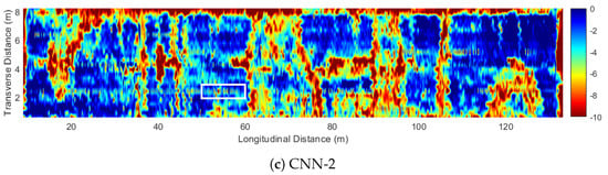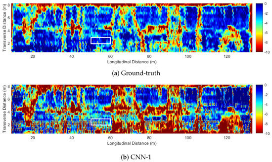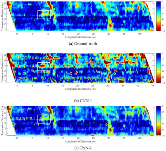 This bridge, which features an asphalt overlay, was constructed in 1960, with a length of 182.9 m (600 ft) and a width of 9.8 m (32 ft). The S092 46282R bridge was decommissioned in 2005 after a replacement bridge was constructed. The deck condition was classified as “Poor” [25] based on 2008 NBI data. In the NBI system, a “Poor” condition indicates advanced section loss, deterioration, spalling, or scour in primary structural elements [26]. The GPR scanning was performed using the GSSI (Nashua, NH, USA) SIR-4000 GPR system with a 1.6 GHz ground-coupled antenna. All scans had a longitudinal resolution 3 mm and a line spacing of 30 cm (1 ft). The GPR amplitude maps are shown in Figure 11, with ground truth, CNN-1 mode, and CNN-2 model. We can see that the differences between CNN-1 and CNN-2 models are significant. The amplitude map given by the CNN-2 model is similar to the ground truth map, while CNN-1 map overestimates the deterioration regions. The B-scan in a region highlighted by a white rectangle is used for further analysis.