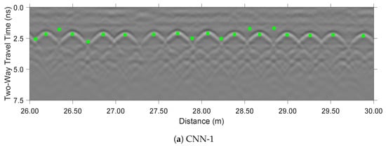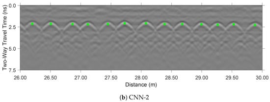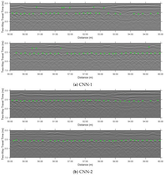Figure 10 shows the picked rebars in the white rectangular area of Figure 9. While both models accurately identify the true rebars, the CNN-1 model has some false predictions regarding the rebar locations. Because the features extracted from raw B-scan images in CNN-1 are insufficient to distinguish genuine hyperbolic patterns, the model cannot fully discriminate between true rebar reflections and noise-induced artifacts, resulting in inaccurate detections. Consequently, these false predictions produce noisy outputs and large deterioration zones in the bridge map generated by CNN-1 (Figure 9b).