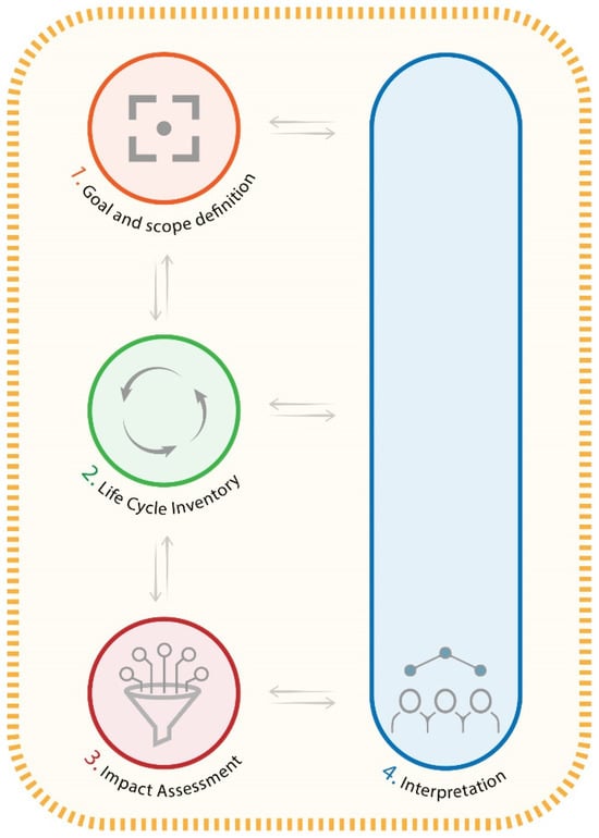 By integrating LCA, designers, engineers, and decision-makers can make informed choices, considering environmental impacts rather than relying solely on initial costs [21]. LCA assesses the environmental footprint of a product from cradle to grave, categorizing emissions into various impact categories, such as climate change, acidification, eutrophication, resource consumption, and toxicity [22,23,24]. As shown in Figure 1, LCA is an iterative process and involves four main steps [24]: