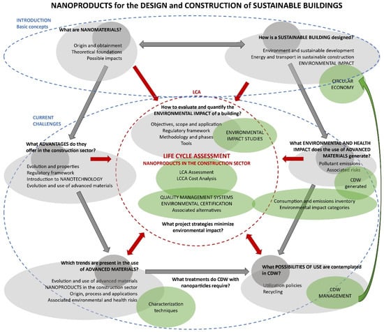 - Identification of the problem and contextualization of basic concepts, thoroughly explained in the introduction, to know the origin and the theoretical foundations of nanomaterials, as well as the environmental impact of the current production system. This section will answer two main questions: what nanomaterials are, and how a sustainable building is designed, which are both closely related.
