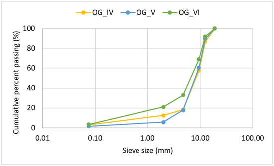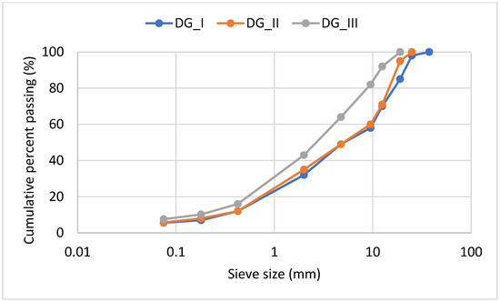 In the context of this research study, a total of 12 mixtures were considered. Specifically, 9 dense-graded mixtures and 3 open-graded mixtures were examined. The mixtures differed based on their aggregate gradation. Within the same gradation, the mixtures further varied in asphalt content. For each asphalt content, 3 specimens were compacted. The dense-graded mixture was produced using 50–70 grade asphalt binder and limestone aggregates, while the open-graded mixture was produced with an 80–100 grade asphalt binder modified with 4% styrene-butadiene-styrene (SBS) and a combination of limestone and steel slag aggregates. Figure 1 and Figure 2 present the aggregate gradation of dense- and open-graded mixtures, respectively. “DG” denotes dense-graded mixtures, where the Roman numerals I, II and III indicate different aggregate gradations. The same naming convention is applied to the open-graded mixtures, labeled as “OG”.