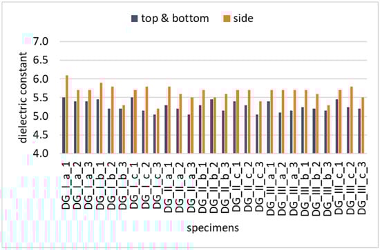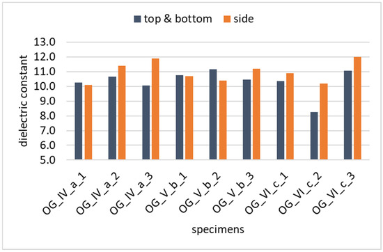 Minimal variation was observed between the dielectric constant values (εr) at the six points on each surface, as well as among the top and bottom readings of a given specimen. The standard deviation of the measured εr at the top and the bottom of the specimen was typically <0.1, while at the side of the specimen, it was <0.2. However, in some cases, the εr values measured along the sides of the specimens differed slightly from those recorded on the top and bottom surfaces (Figure 4 and Figure 5). This discrepancy may be attributed to factors such as minor compaction variability along the specimen height, slight differences in surface texture due to coring and cutting processes or challenges in achieving full and uniform contact between the curved probe and the side surface. Therefore, for further analysis, three εr values were considered for each specimen: the average of the top and bottom surface readings, the average of the side surface readings and the combined average of all measurements across all surfaces.