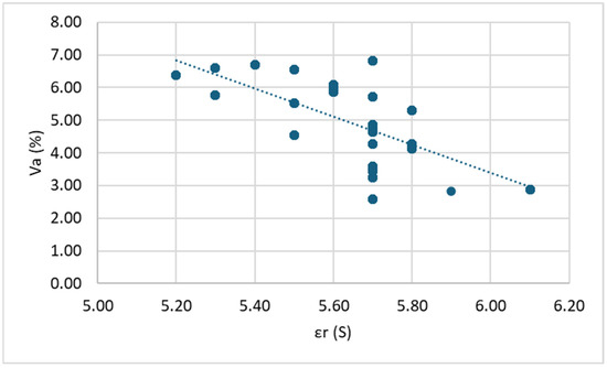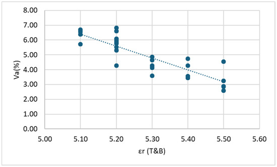 To evaluate the strength of these relationships, the coefficient of determination (R2) is considered. For dense-graded (DG) mixtures, a strong correlation is evident between Va and εr values measured at the top and bottom surfaces, as well as the total average. However, εr values obtained from side measurements show only a moderate correlation. Likewise, the correlation between Vbeff/(Vbeff + Va) and εr is moderate to weak when using side measurements.