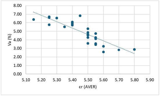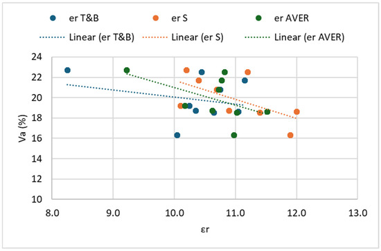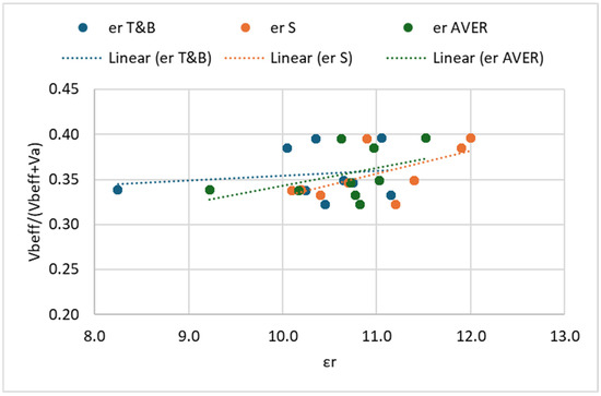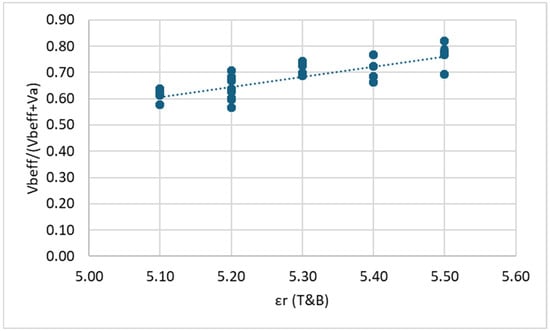 In all cases, it is observed that within each mix (DG and OG), as the dielectric constant (εr) increases, the air void content (Va) decreases. This observation aligns with the existing literature, which indicates that air, having a dielectric constant close to 1, reduces the overall dielectric constant of asphalt mixtures. Consequently, specimens with lower air void content exhibit higher εr values. On the other hand, a clear positive linear trend is observed between εr and the ratio Vbeff/(Vbeff + Va). This relationship is expected, as higher εr values are associated with reduced air voids and/or increased effective binder volume, both of which contribute to a higher ratio.
