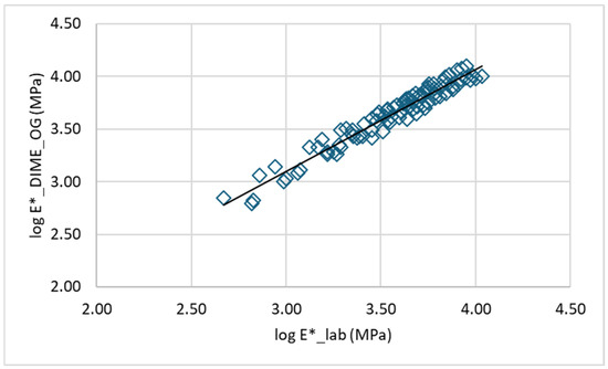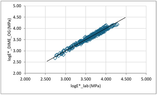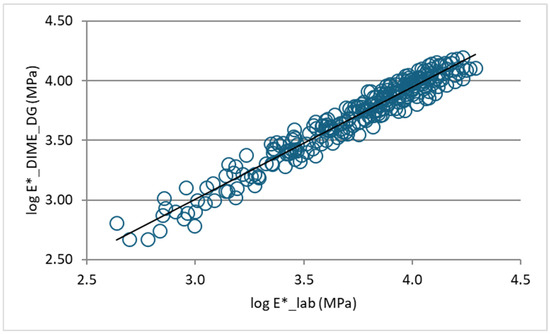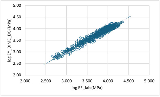 The applicability of the DIME models was assessed using scatter plots comparing the measured dynamic modulus values (E*_lab) with the predicted values (E*_DIME), as shown in Figure 14 and Figure 15, for the DG and OG mixes, respectively. The line of equality is also included to evaluate the accuracy of the predictions.
