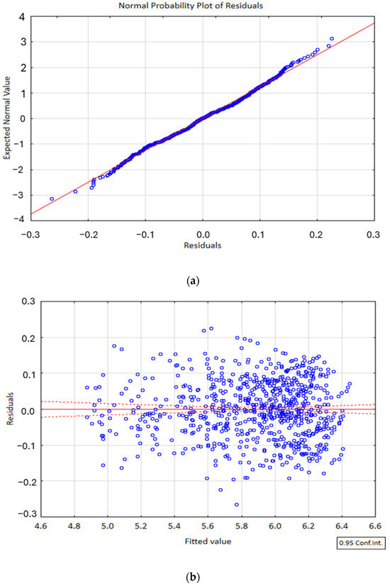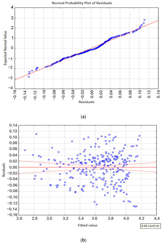 The normal probability plot of the residuals (Figure 16a and Figure 17a) indicates that the residuals closely follow a straight line, suggesting that they are approximately normally distributed. This supports the assumption of normality, which is critical for the validity of regression-based modeling. Additionally, the residuals versus fitted values plot (Figure 16b and Figure 17b) shows a random scatter of points around the zero line, with no discernible pattern or systematic structure. This randomness implies that the variance of the residuals remains relatively constant across the range of fitted values, satisfying the assumption of homoscedasticity. Together, these results confirm that the model predictions are statistically sound and that the residuals do not exhibit any major violations of the underlying assumptions.