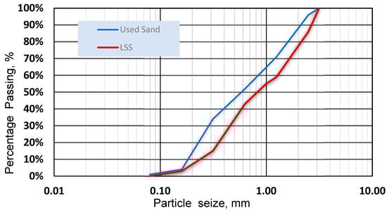 Particle size distribution of used sand and lightweight synthesized sand (LSS) aggregates.