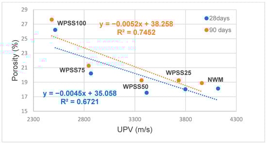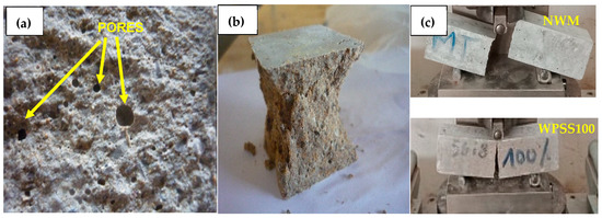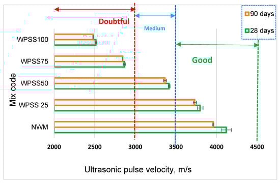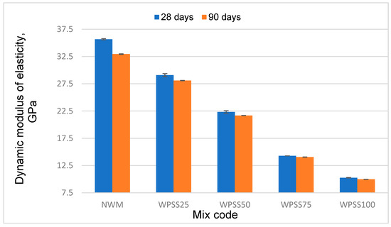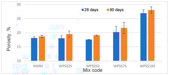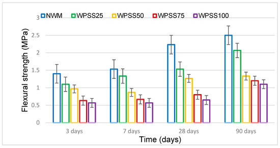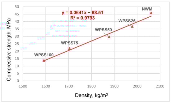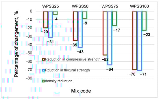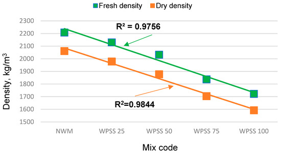 Likewise, a gradual reduction in the hardened density of WPSS composites was also noticed. Indeed, Figure 3 clearly shows that, at 28 days, drops of 4, 9, 17 and 23% were recorded, respectively, for WPSS25, WPSS50, WPSS75 and WPSS100, in comparison with NWM. It should be noted that, in this study, the density of WPSS100 is 1592 kg/m3 because of the low density of LSS (1.68 g/cm3) compared with that of natural sand (2.630 g/cm3). It was also found that the densities of the composites with the replacement percentages 75 and 100% meet well the classification criteria of lightweight aggregate concrete as required by the ACI 213R guide [9]. These results are consistent with those found by [45,56].