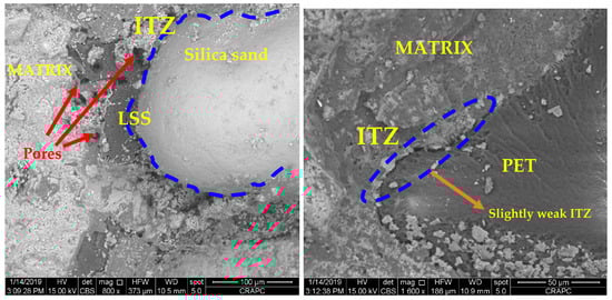 The incorporation of LSS demonstrates a significant improvement in the interfacial transition zone (ITZ) with the cement matrix, enhancing the overall bonding quality and potentially contributing to improved mechanical performance and durability. Addressing a critical research gap in plastic-based aggregate applications, we develop a thermal synthesis process to transform two abundant waste streams—discarded PET bottles and dune sand—into high-performance construction materials. Our approach uniquely targets the simultaneous achievement of three essential properties: structural integrity, thermal efficiency, and alkali–silica reaction resistance. Through systematic investigation of the microstructure–property relationships in these composites, this work advances new paradigms for sustainable construction materials that align with circular economy principles while meeting practical engineering requirements.