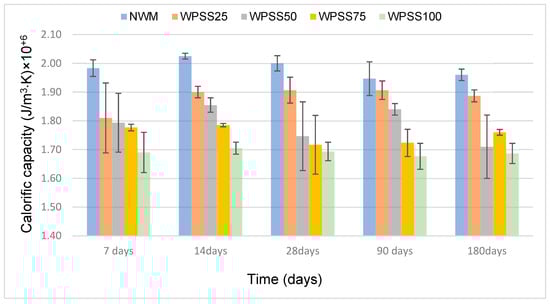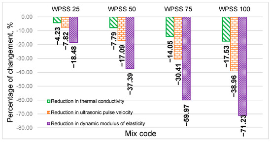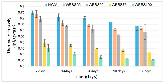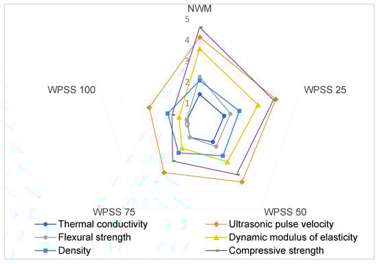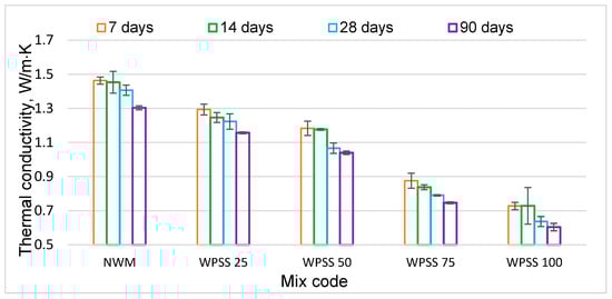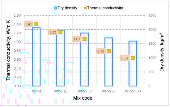 - The thermal performance of WPSS composites was improved. Indeed, the thermal conductivity of WPSS25, WPSS50, WPSS75, and WPSS100 mixtures was improved by 4%, 8%, 14%, and 18%, respectively, compared with that of NWM. This result encourages us to apply this type of synthesized aggregate LSS in thermal insulation materials due to its energy performance.