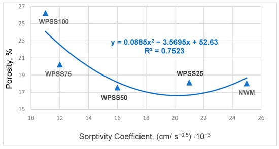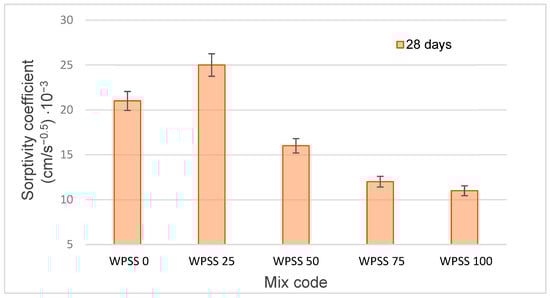 - The measured sorptivity coefficient decreased progressively with increasing WPSS content. Compared with NWM, the sorptivity was reduced by approximately 22%, 38%, 43%, and 46% for WPSS 50, WPSS 75, and WPSS 100, respectively. Therefore, the incorporation of LSS can be considered more durable, with enhanced resistance to water penetration, making it suitable for use in eco-efficient cement-based materials.