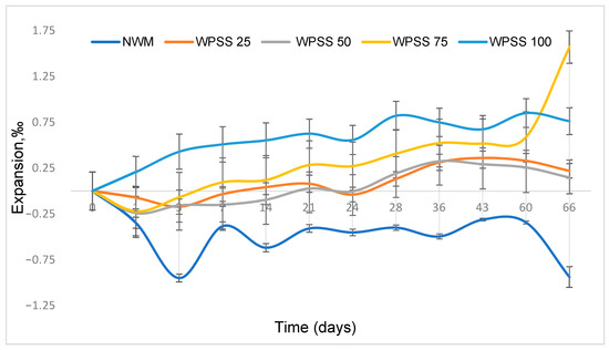 According to the criteria of the ASTM C1260 [53] standard, a mix is considered acceptable if the expansion of the specimens after 14 days is less than 0.10%. An expansion greater than 0.20% is deemed potentially deleterious. In this study, five mortar mixes, including a reference mix and mixes with varying percentages of WPSS aggregates, were tested. Each mix was prepared with at least three replicate specimens to ensure the accuracy of the results. Length measurements (precision: 0.001 mm) were taken initially and after 1, 3, 7, 14, 21, 28, 36, 43, 60, and 66 days to monitor expansion.