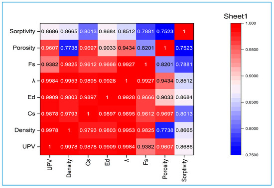 The ultrasonic pulse velocity (UPV) technique serves as a non-destructive testing method to evaluate mortar specimens by measuring the transmission time of high-frequency sound waves. This approach provides valuable insights into material homogeneity, detection of internal flaws such as cracks or voids, monitoring of temporal property variations, and assessment of both physical and dynamic material characteristics. All experimental measurements were conducted at the LABMAT laboratory of the ENPO Maurice Audin school, in compliance with ASTM C597-02 [50]. We used a Punditlab ultrasonic testing apparatus manufactured by Proceq (Schwerzenbach, Switzerland), with an accuracy of 0.1 µs (micro second). The measurements were performed on three samples for each mortar formulation to ensure result reliability.