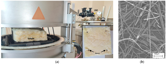 For the study of thermal conductivity of mineral fiber samples, samples of mineral wool with the characteristics presented in Table 1 were used. The samples were placed in a chamber that was cooled with liquid nitrogen. Spacers were used to fix the thickness of the samples (Figure 1). The load on the samples was 500 Pa.