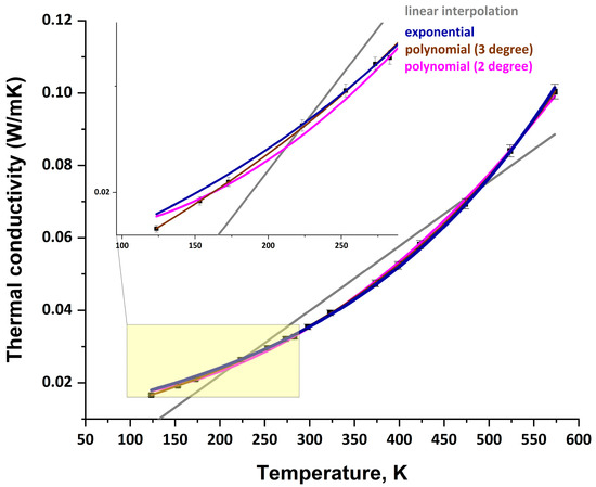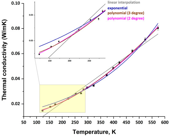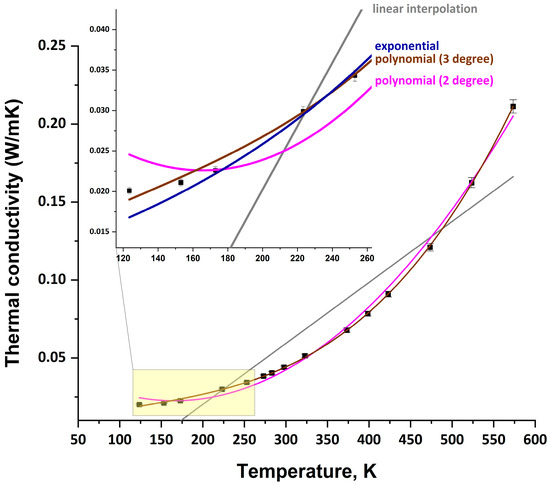 Many researchers use a linear model to approximate data for inaccessible temperature intervals [5]. At the same time, our results revealed an interesting feature: for low-density samples, this approach does not work. While for cases with densities above 30 kg/m3, linear approximation can be applied with sufficient accuracy, for lightweight materials (which are often used in practice), this approach involves considerable inaccuracies. As seen in Figure 6, within the temperature range below 180 K and above 450 K, the thermal conductivity of such materials exhibits strong nonlinearity. We believe that such changes in material properties are likely determined by the radiative component, which has a cubic dependence on temperature (Equation (2)).